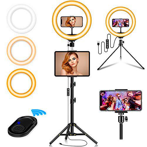 Luz de Anillo LED,Ring Light,Aro de Luz de 10"con Trípode/Mini Trípode Control Remoto Bluetooth,3 Modos de Luces 10 Brillos Regulable para Móvil Selfie,Fotografía,Maquillaje,Youtube,TIK Tok Live