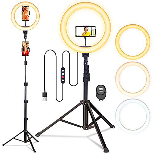 ✲【Aro de luz con soporte】3 modos de iluminación (blanco, amarillo y blanco cálido) y 10 niveles de brillo le ofrecen 30 opciones en total. Fácil de ajustar para satisfacer sus necesidades y hacer que su foto/video se vea más profesional..